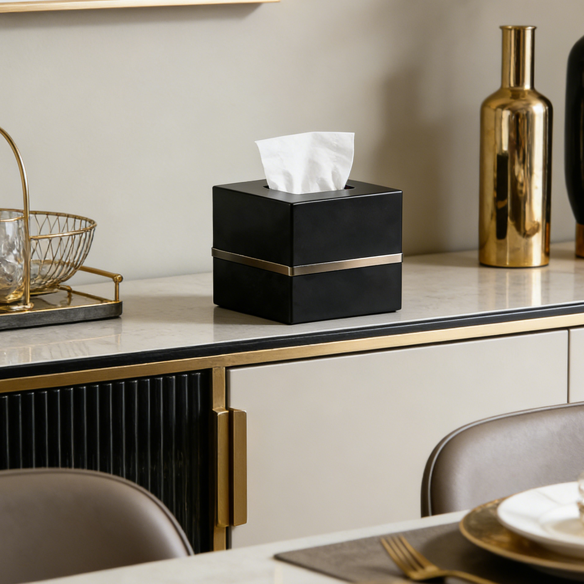 Elevate your everyday essentials with this striking tissue box that seamlessly blends contemporary design with timeless elegance. The bold black and gold color-blocking creates a refined aesthetic that complements any room's décor, from modern minimalist spaces to classic interiors. Crafted with attention to detail, this functional piece serves as both a practical necessity and a sophisticated accent. Perfect for desks, nightstands, or living areas, it transforms a simple utility item into a statement of refined taste.