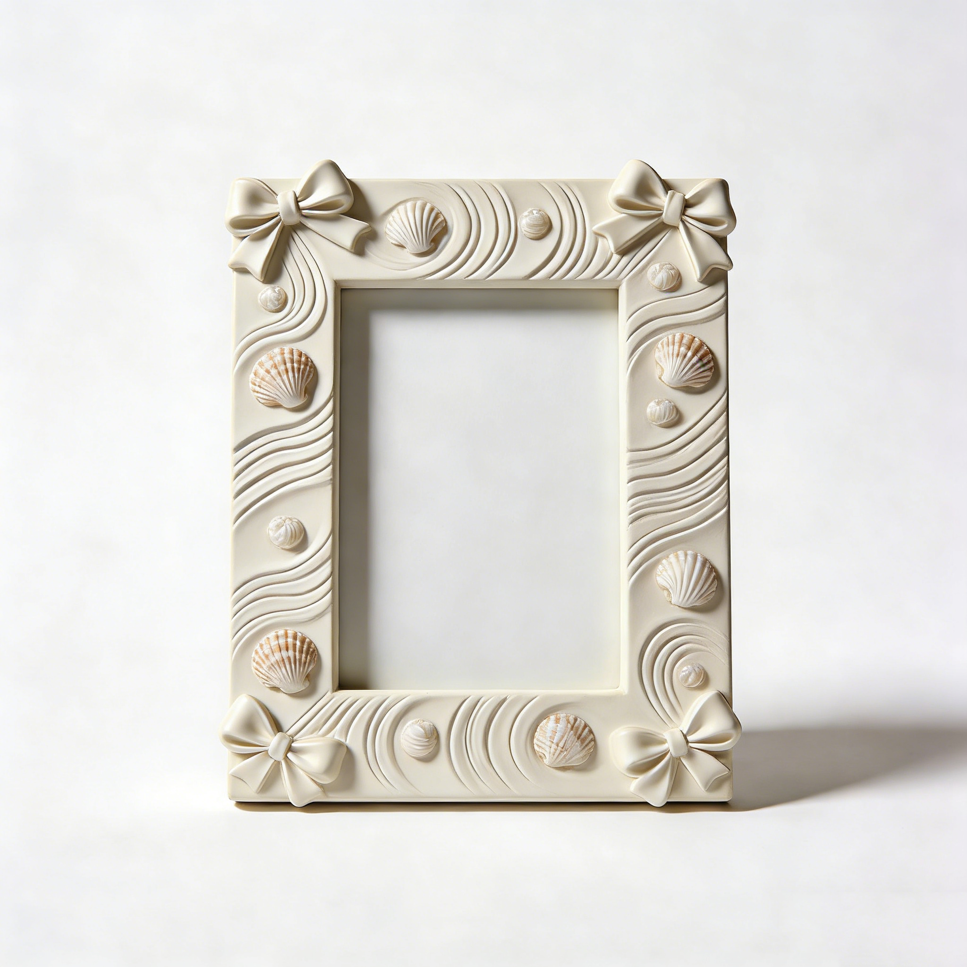 Nautical Style Bow & Shell Relief Photo Frame, smooth white ceramic with 3D nautical bow-shell relief. Size: 18×23cm (7×9inch). Classic nautical design, perfect for bathroom and coastal-themed room decor.